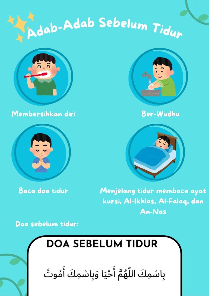 This poster contains a brief explanation of the etiquettes before sleeping according to Islamic teachings, such as reciting prayers, performing wudu, and sleeping in the correct position. With an attractive design and easy-to-understand language,